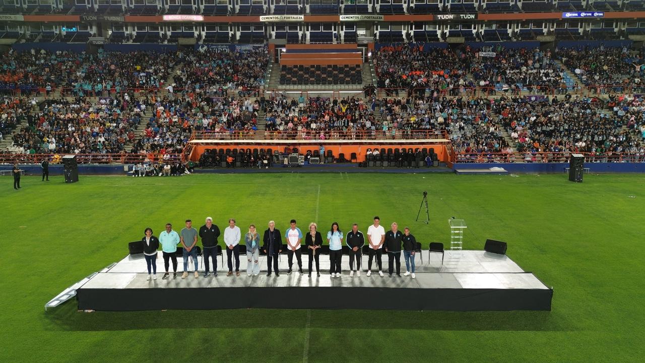 PACHUCA, HGO.- Con la presencia de el Lic. Jesús Martínez Patiño, Presidente de Grupo Pachuca; la Dra. Gabriela Murguía Cánovas, Rectora de la Universidad del Futbol; directivos y jugadores de los equipos varonil y femenil, se inauguró el noveno torneo internacional de escuelas filiales en el Estadio Hidalgo.